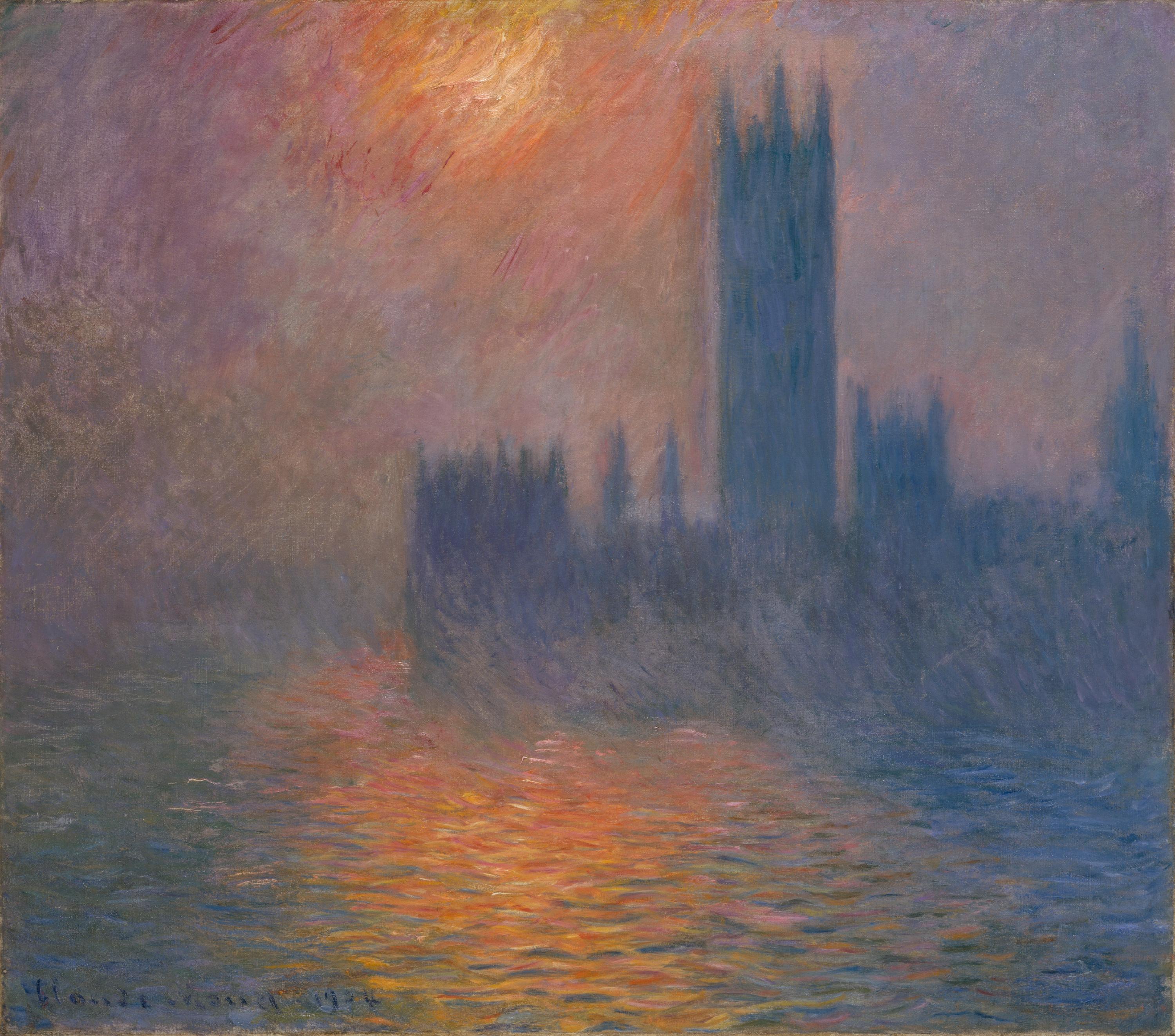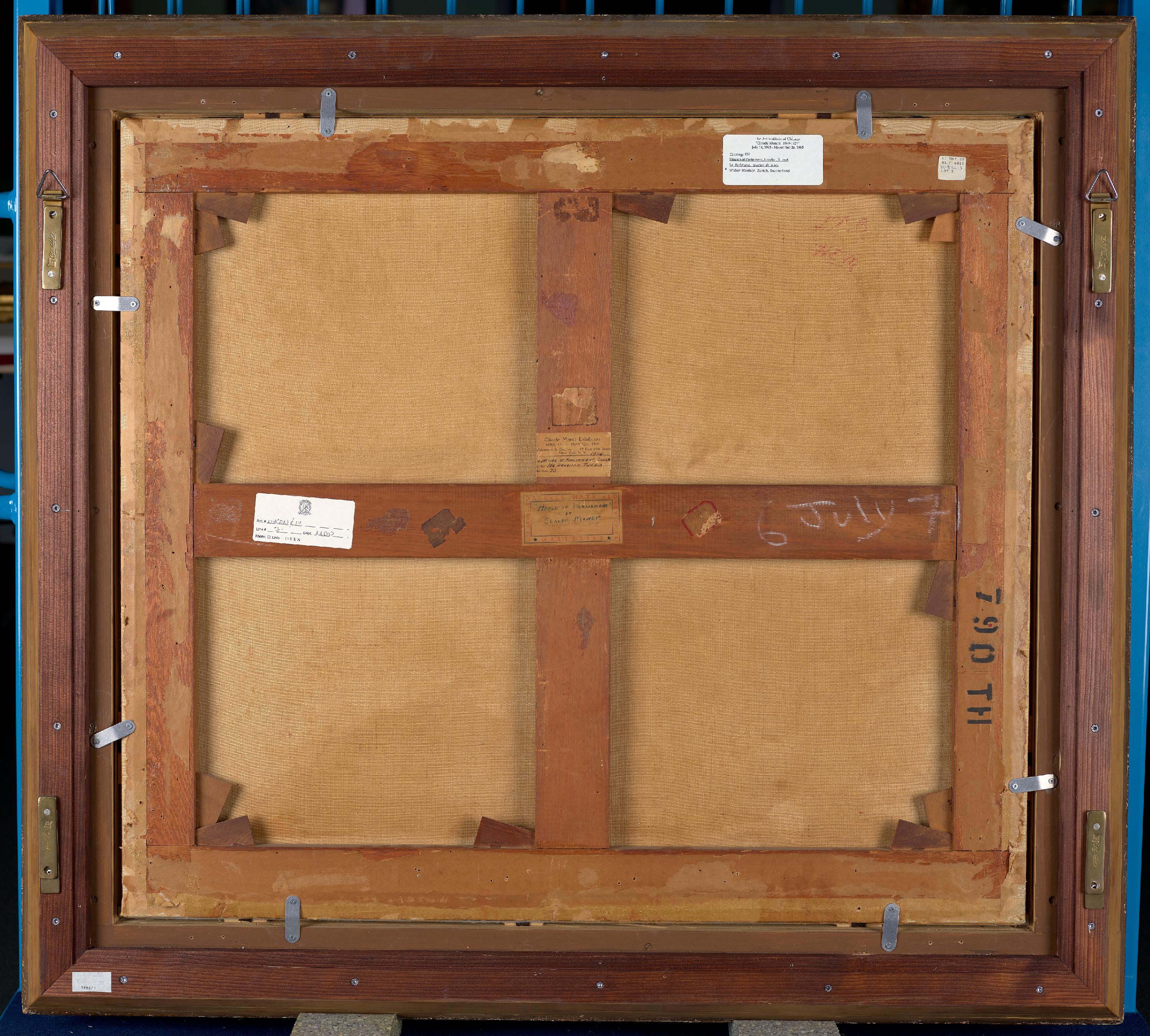 verso o. l. auf Schutzkarton weisse Etikette in Blau/Schwarz: FONDATION BEYELER / CH-4125 Riehen / Basel / Monet / 22.01.2017 – 28.05.2017 / Claude Monet / Le Parlement, coucher de soleil, 1904 / L17.1.053; darunter weisse/orange Etikette in Weiss/Schwarz: THE NATIONAL GALLERY Trafalgar Square, London WC2N 5DN / Telephone 020 7839 3321 / Exhibition: The Credit Suisse Exhibition: Monet & Architecture / The National Gallery (London) 09/04/2018 to 29/07/2018 / Number: X9412 / Artist: Claude Monet / Title: Houses of Parlament Sunset / Credit Line: Kunsthaus Zürich, Geschenk Walter Haefner, 1995; o. M. blaue KHZ-Etikette in Schwarz; u. M. rote Etikette in Schwarz: Attention / Special Security Glass / Do not tape; o. l. auf zweitem Schutzkarton mit Grafitstift: 118; daneben weisse Etikette in Schwarz: 79. Claude Monet AGO / French, 1840-1926 / Houses of Parliament, Sunset, 1904 / oil on canavas / Kunsthaus, Zurich. Gift of Walter Haefner. / Turner Whistler Monet: Impressionist Visions / AGO, Toronto: 12 June to 12 September, 2004 / RMN/Musée d’Orsay, Grand Palais, Paris, / 12 October, 2004 to 17 January, 2005 / Tate, London: 10 February – 15 May 2005; darin [hs] mit Grafitstift: CRATE 46; darunter weisse Etikette in Schwarz: Turner Whistler Monet / Tate Britain 10 February – 15 May 2005 / Cat. no. 79 / MONET, Claude 1840-1926 / Houses of Parliament, Sunset 1904 / Oil on canavas / 810 x 920 mm / Kunsthaus (Zurich, Switzerland) / X09308/ / TATE ; o. M. blaue KHZ-Etikette in Schwarz; o. r. weisse Etikette in Blau/Schwarz: MONET IN THE 20TH CENTURY / Museum of Fine Arts, Boston / September 20-December 27, 1998 / Royal Academy of Arts, London / January 21-April 18, 1999 / Cat. 24 W. 1607 / Le Parlement, coucher de soleil; / Houses of Parliament, Sunset, 1904 / Kunsthaus Zürich; darunter weisse Etikette in Schwarz: m [in Kreis] Réunion des musées nationaux / Exposition: Turner, Whistler, Monet / Lieu : Paris / Dates : 12/10/2004 – 17/01/2005 / Titre de l’œuvre : Le Parlement, coucher de / soleil / Auteur : Monet (Claude) / N° catalogue : 83 [durchgestrichen] [hs] 79 / Propriétaire : Kunsthaus Zürich [hs mit Grafitstift] P; auf Zierrahmen keine Provenienzmerkmale vorgefunden ; o. l. auf Keilrahmen Spuren einer abgelösten Etikette; rechts daneben mit Grafitstift: [unleserlich]; o. m. Spuren eines Stempels in Blau: A[unleserlich?]; o. r. weisse Etikette mit abgerundeten Ecken in Schwarz: The Art Institute of Chicago / «Claude Monet: 1840-1926» / July 14, 1995 – November 26, 1995 / Catalog: 122 / Houses of Parliament, London, Sunset / Le Parlement, coucher de soleil / Walter Haefner, Zurich, Switzerland; daneben weisse Etikette in Schwarz: [ms] 10 MAY 89 / SALE 6810 / [hs] WALLIS; [ms] LOT 5; o. auf mittlerer Strebe des Keilrahmens Spuren einer abgelösten Etikette; darunter Spuren einer abgelösten Etikette; darunter teilweise abgelöste Etikette in Schwarz: PICT[abgerissen]; darunter braune Etikette in Schwarz: Claude Monet Exhibition / APRIL 11th to MAY 12th, 1945 / Wildenstein & Co. [Inc?] 19 East 64th Street / New York, N. Y. / [T?]itle / [L?]ender / Number; darin in Schwarz: [hs] 1904 / HOUSES OF PARLIAMENT, SUNSE[t?] / MR. HARRISON TWEED / 73; m. Querstrebe Spuren einer abgelösten Etikette; daneben weisse Etikette in Schwarz: Porträt-Siegel / Ref.# / Line # Dept. / Photo: Color B&W; darin in Schwarz: [hs] NYCEN [unleserlich] 14 / 7 / MDP; [Christie’s Etikette]; daneben Spuren einer abgelösten Etikette; daneben Spuren einer abgelösten Etikette; m. braune Etikette in Rot: DALZELL HATFIELD / LOS ANGELES / NEW YORK / GALLERIES; darin in Schwarz: [hs] «HOUSE OF PARLIAMENT» / BY / CLAUDE MONET; r. daneben braune, zum Teil abgelöste Etikette doppelt rot eingefasst mit abgeschrägten Ecken in Schwarz: 8024 / [unleserlich]; daneben Kreide in Weiss: 6 July 71; r. Strebe Stempel in Schwarz: 790 TH; mittlere Strebe des Keilrahmens Spuren einer abgelösten Etikette; u. r. auf Keilrahmen in Grafitstift: 33[.2?]; unterstrichen; o. r. auf Leinwand Kreide in Rot: [77?].B / [HEIN?] [unterstrichen].
